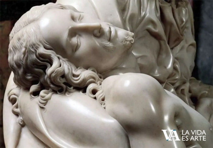 La Virgen María, esculpida con una serenidad y una tristeza profundas, sostiene en sus brazos a su hijo, Cristo, cuyo cuerpo sin vida emana una paz trágica. La composición piramidal de la escultura, con la figura de María extendiéndose en una base amplia que se eleva hasta la cabeza de Cristo, crea un equilibrio perfecto, una armonía divina que refleja la paz del alma en medio del sufrimiento.