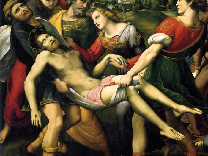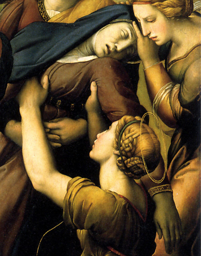 Rafael demuestra su maestría en la composición y la técnica en La Deposición de Cristo. La escena está cuidadosamente organizada, con un enfoque en la simetría y el equilibrio. El cuerpo de Cristo es el punto focal, alrededor del cual se disponen las demás figuras en una disposición que guía la mirada del espectador a través de la pintura.
